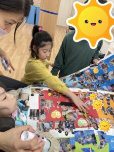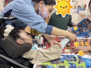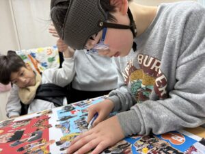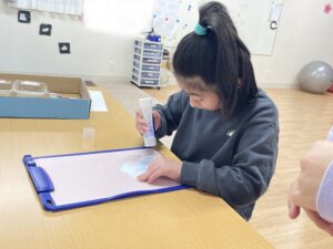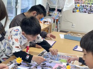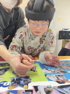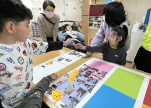 みんなで選んで切った写真を台紙に貼っていくよ♪